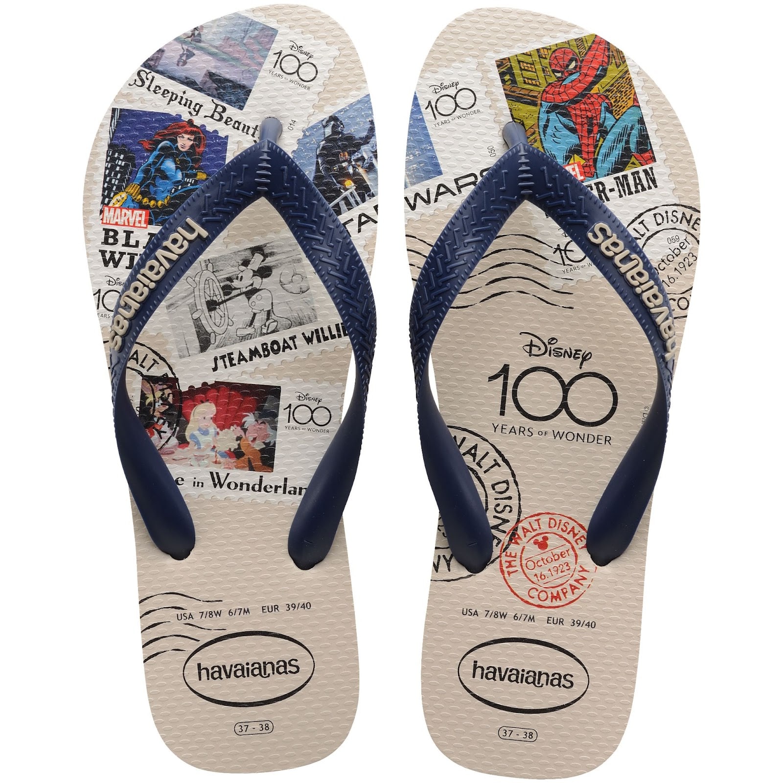 – O Chinelo Havaianas Top Disney 100 Past traz um pouco da história da Disney na forma de selos estampados na sola, seguindo o mood das estampas presentes na Mala de Viagem Havaianas Disney 100 e na Shoulder Bag Havaianas Disney 100. Tem o Mickey Mouse em seu primeiro filme, Alice no País das Maravilhas durante o chá com o chapeleiro, Darth Vader, o vilão mais famoso de Star Wars e até referências aos heróis da Marvel. As tiras azul marinho dão o toque final. É um item de colecionador mesmo!