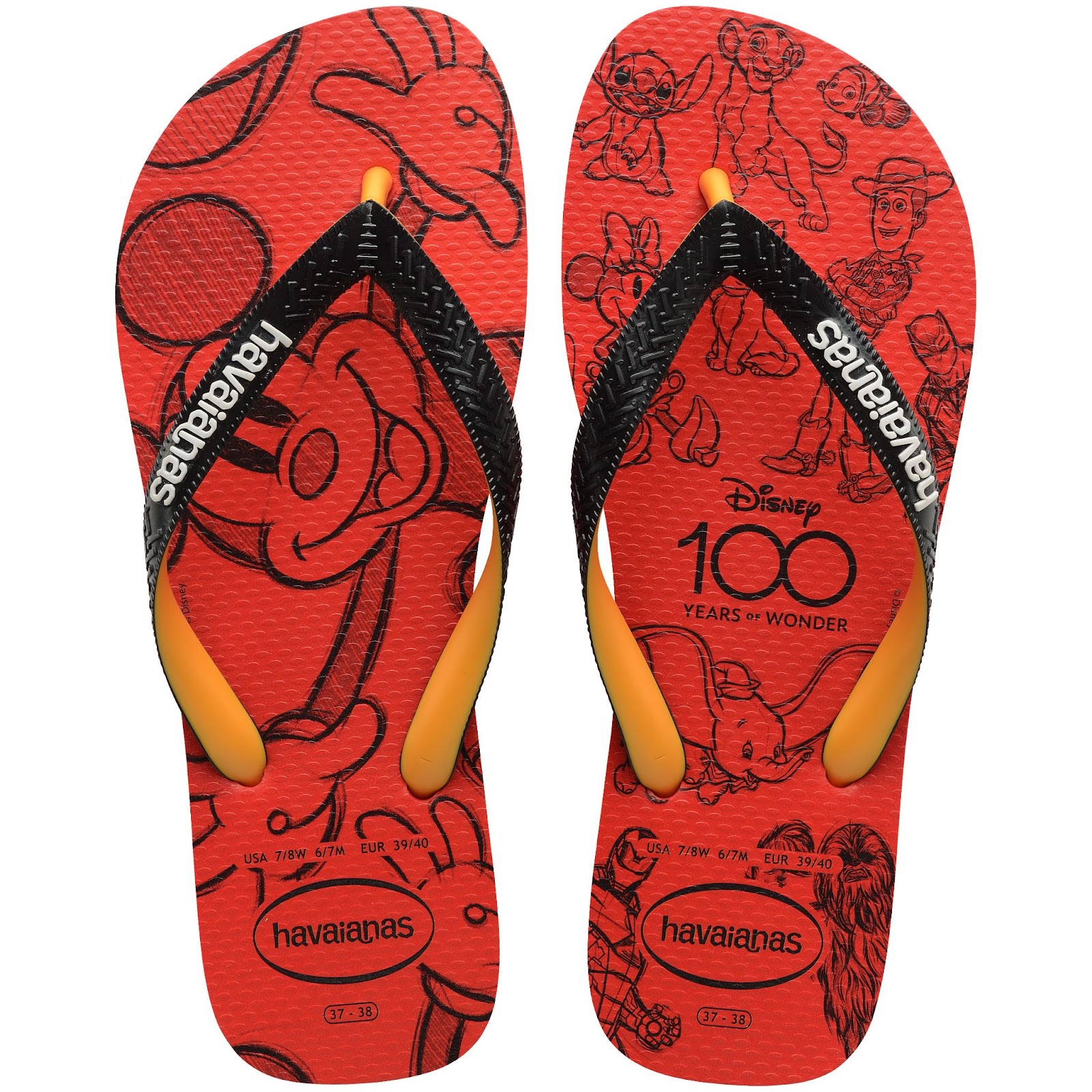 – Colorida nas cores de Mickey Mouse, o Chinelo Havaianas Top Disney 100 Present, comemora 100 anos dos universos da Disney, Pixar, Marvel e Star Wars com alguns de seus personagens mais clássicos, de Dumbo a Woody, Stitch e Simba – além do próprio Mickey, claro! As tiras bicolores são um charme a parte.
