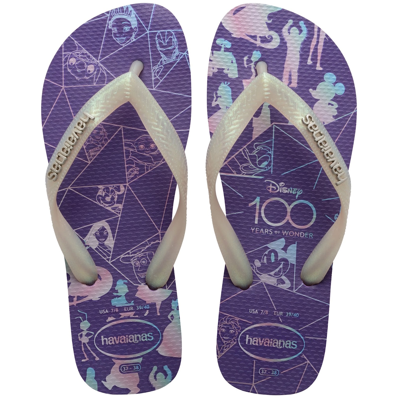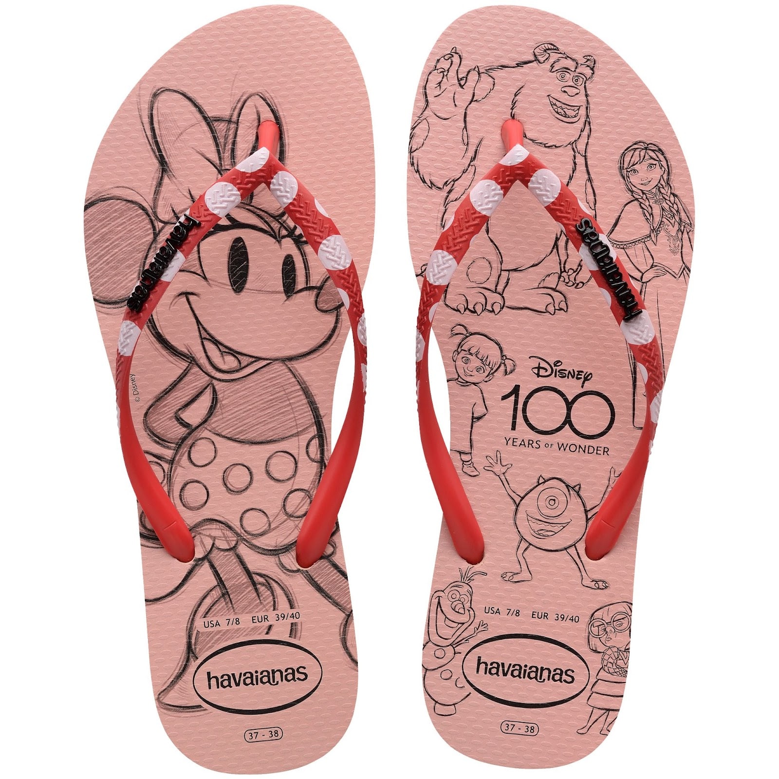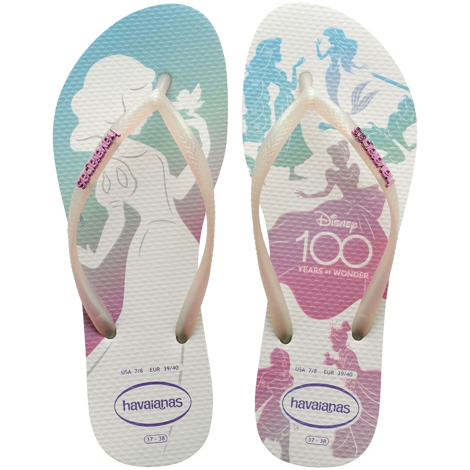 – O Chinelo Havaianas Slim Disney 100 Celebration comemora o centenário da Disney destacando suas princesas, com uma estampa minimalista que traz os contornos das personagens e cores degradê que vão do verde ao roxo. A cereja do bolo fica com as tiras slim com efeito perolado e logo metálico rosa.
