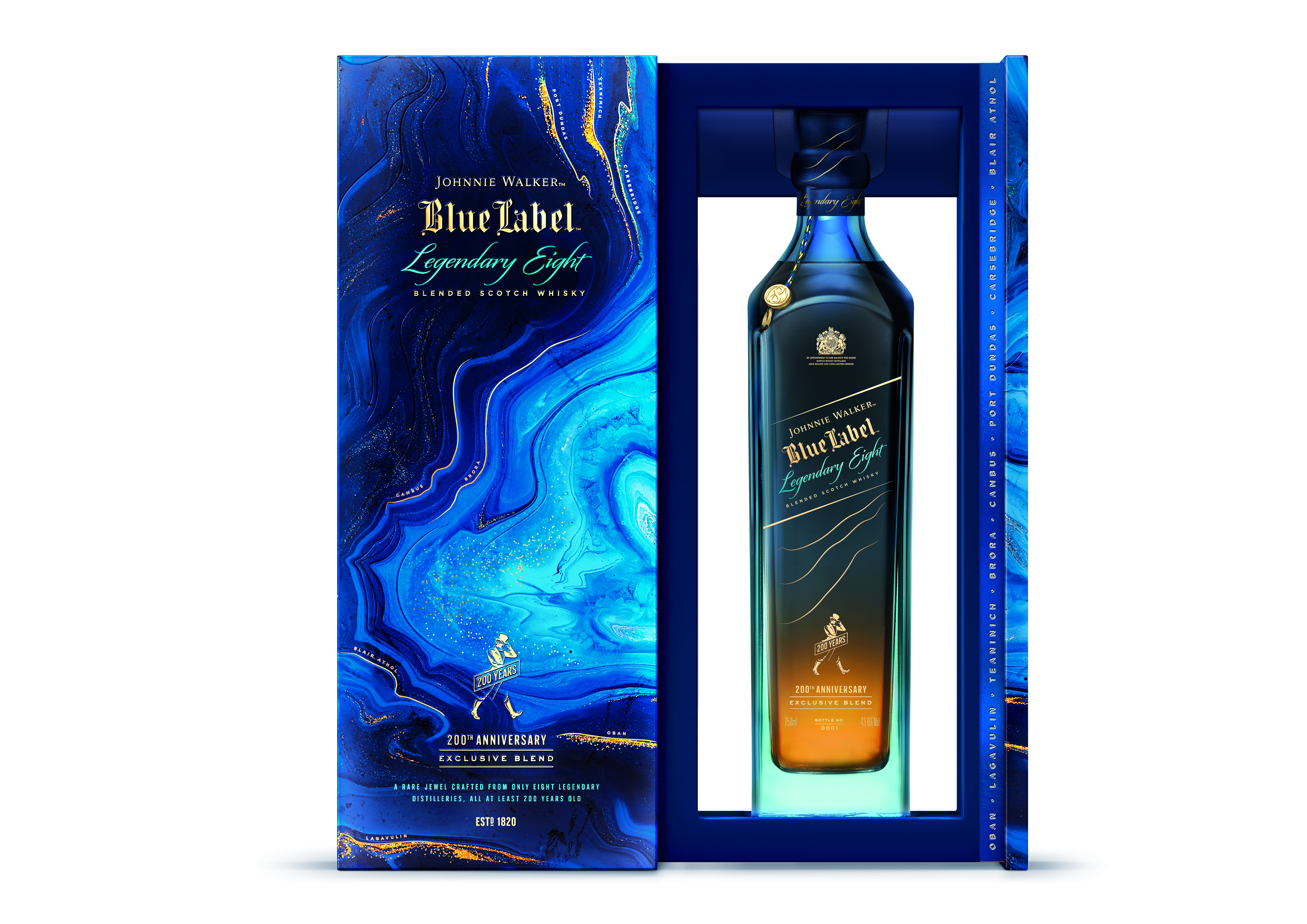 Entre os meses de setembro e dezembro, as linhas Johnnie Walker Gold Label e Blue Label também ganham suas embalagens comemorativas de 200 anos. A garrafa de Gold Label, com design singular e produzida em tons dourados, remete às tradicionais camadas de frutas, baunilha, especiarias e defumação. Já Blue Label traz uma caixa especial e comemorativa com ilustrações que mostram a história da família Walker, prestando homenagem às cidades que fizeram a história da marca nos últimos dois séculos.