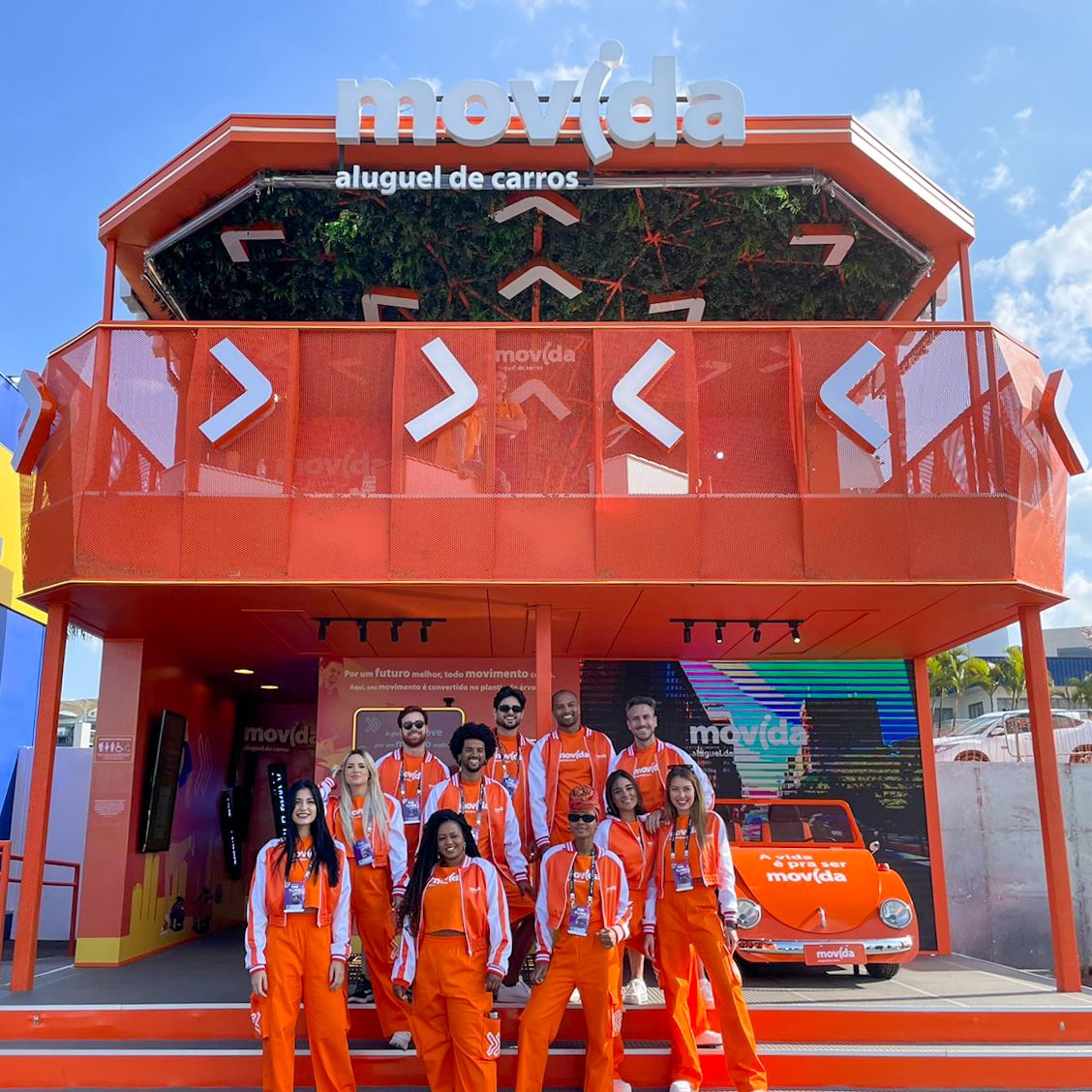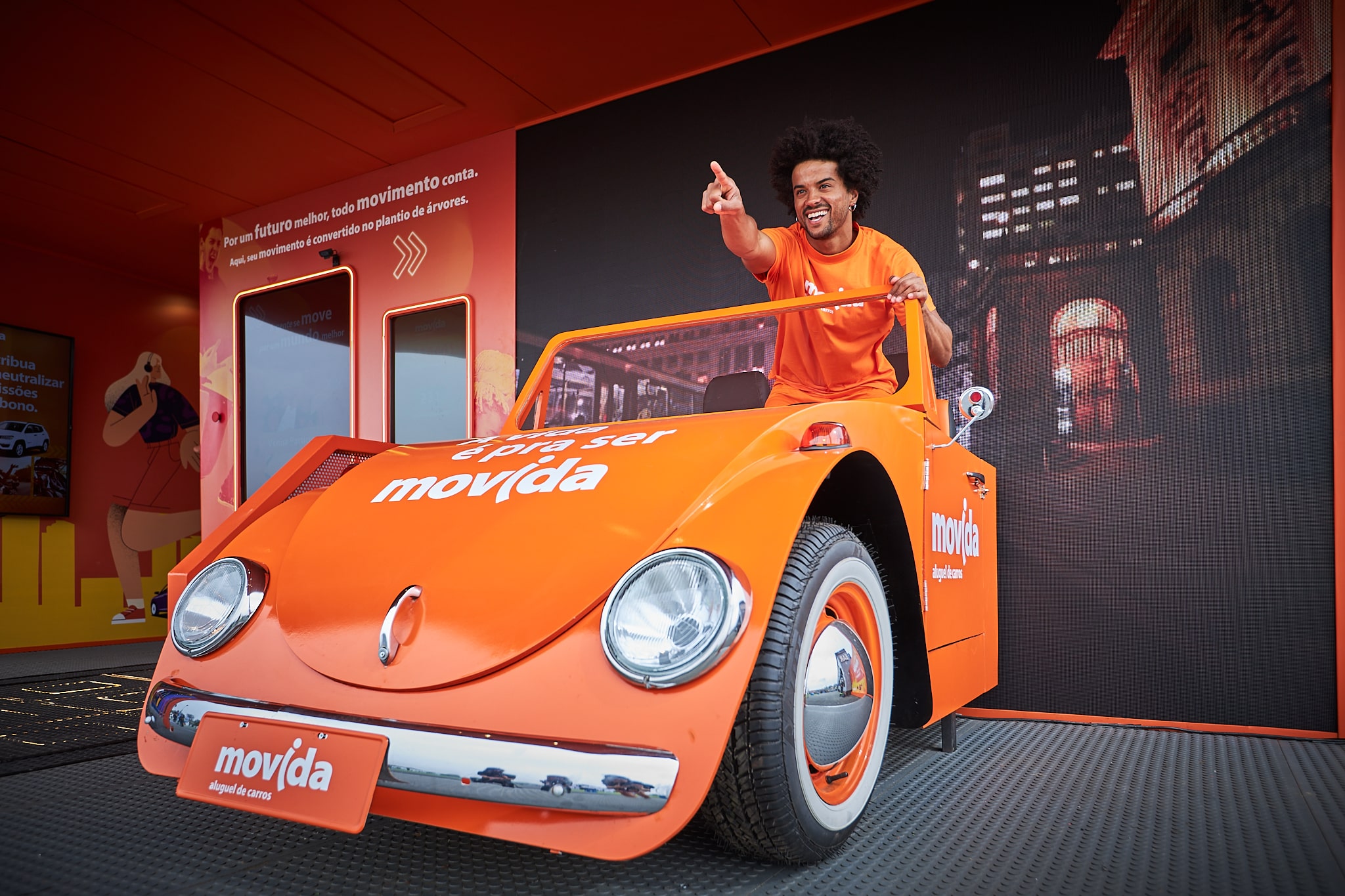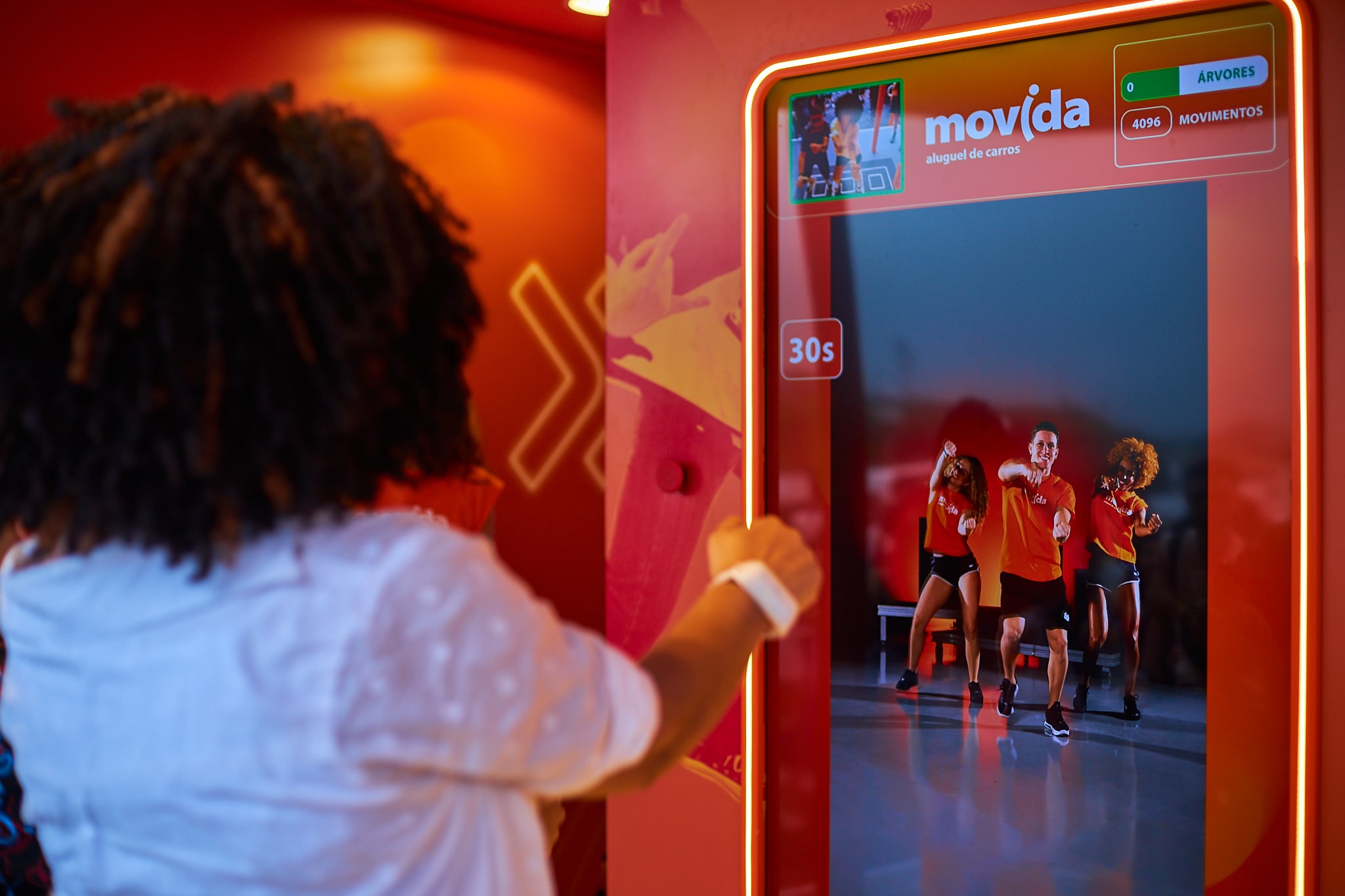 No estande da Movida, há uma pista de dança onde os visitantes são a atração principal. Em frente ao telão, é possível dar início ao desafio, que consiste em dançar o RAP da marca, como em um videogame. As rimas, que falam sobre os serviços e diferenciais que a empresa oferece aos seus clientes, dão ritmo ao show e a soma de passos das dancinhas realizadas é convertida no plantio