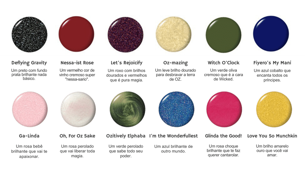 “OPI x Wicked é uma colaboração que começou de forma orgânica. Começamos a trabalhar com a maquiadora, o cenógrafo e o figurinista, e a inspiração cresceu a partir daí”, explica a cofundadora e embaixadora de OPI, Suzi Weiss-Fischmann. “Tivemos muitas ideias no set, e isso se traduziu em toneladas de efeitos e cores, todos inspirados por este mundo mágico de Wicked. Depois que os tons foram criados, trabalhamos com a Universal para criar nomes em conjunto com base nos temas e personagens do filme.” “Fui ao set e vi OPI por todo o lado. Pude ver como as unhas eram uma parte tão importante dos personagens, e eu sabia que poderíamos trabalhar essa mágica juntos, OPI e Wicked”, acrescenta a Diretora Global de Color Equity de OPI, Jill Bartoshevich. “Pegamos os cinco temas do filme: empoderamento, igualdade, integridade, desafio e sororidade, e os interpretamos por meio das cores da coleção.” Confira abaixo as 12 cores de OPI x Wicked em Nail Lacquer: