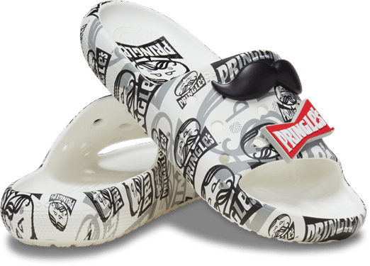 – Pringles x Crocs Classic Slide: Um clássico será sempre um clássico. Neste modelo, os fãs podem usar chinelos com um design retrô em preto e branco do Mr.P e o seu estiloso bigode, uma das principais características do personagem.