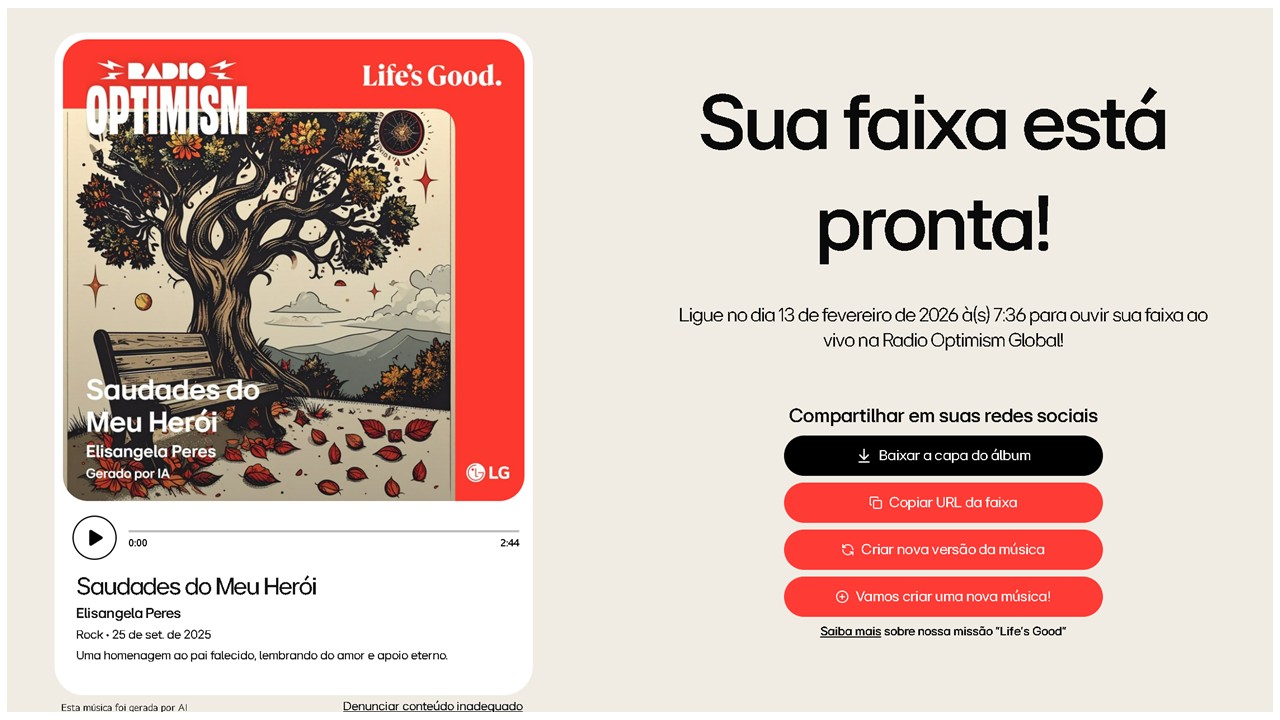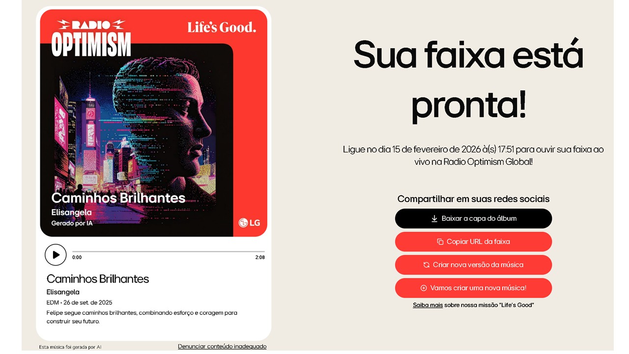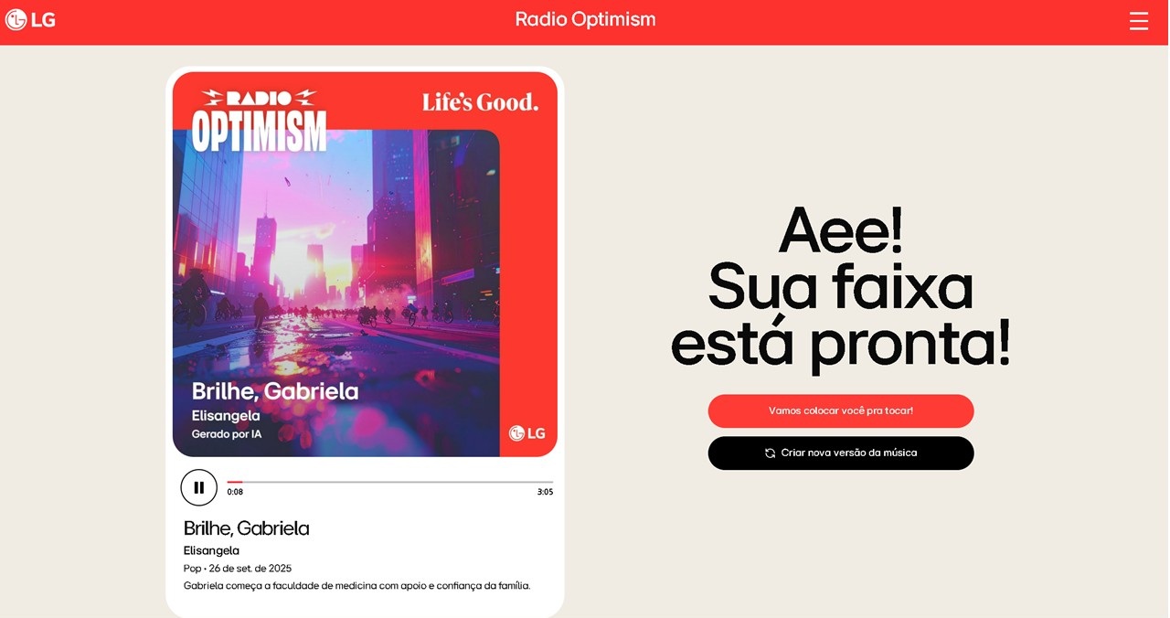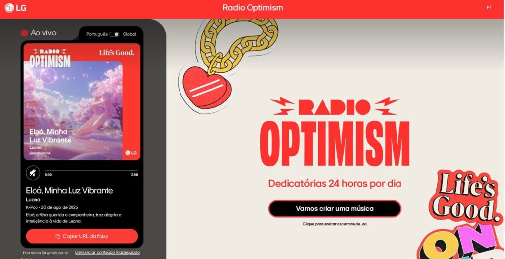 Há músicas que se tornam parte da nossa história. Um hit que lembra a infância, uma melodia que marca uma despedida, um refrão que eterniza o amor por alguém especial. A música tem esse poder de traduzir sentimentos em sons e guardar lembranças em versos. Pensando nisso, a LG criou a Radio Optimism, uma plataforma que transforma recordações em músicas personalizadas com a ajuda da inteligência artificial. Mais do que tecnologia, o projeto é um convite para celebrar conexões humanas e espalhar otimismo pelo mundo.
