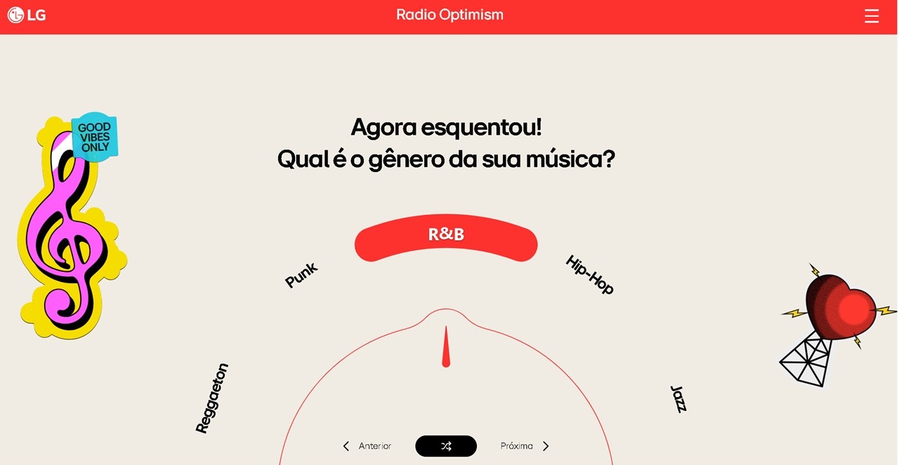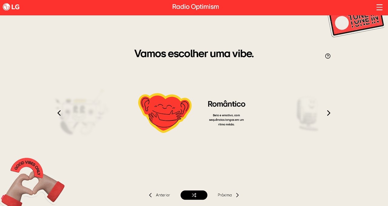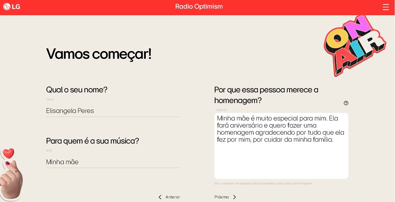Ao acessar o site radiooptimism.lg.com, o usuário encontra a opção “Vamos criar uma música” e começa a jornada escrevendo, em poucas frases, para quem é a homenagem e qual lembrança ou sentimento gostaria de eternizar.