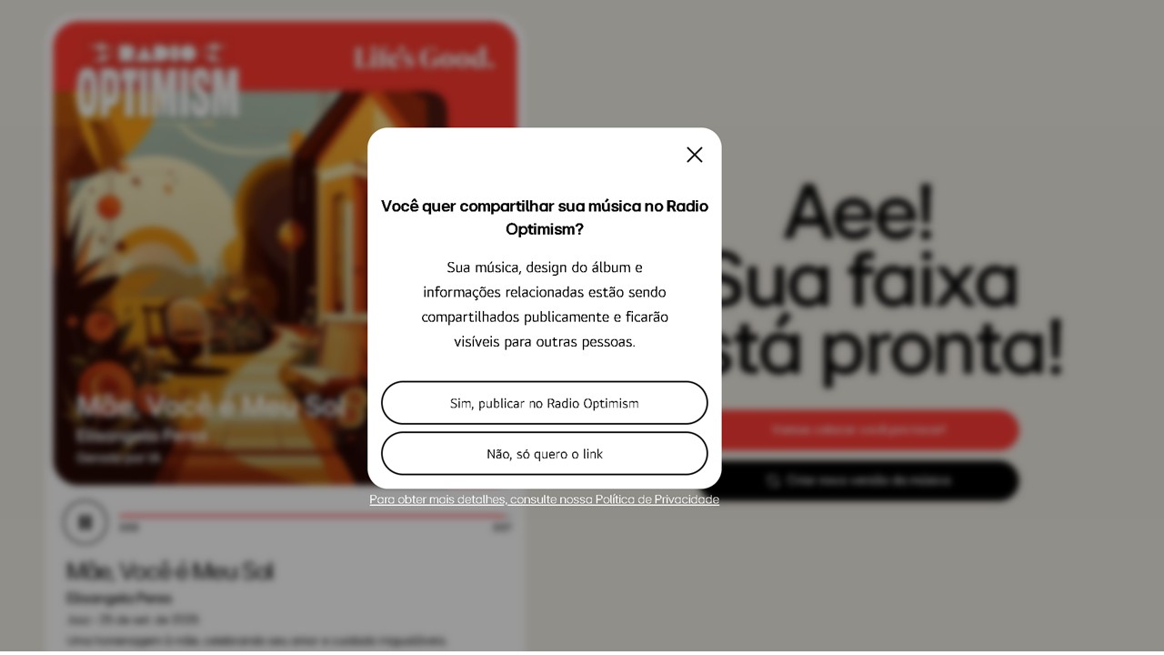 A experiência fica ainda mais especial ao compartilhar o resultado. Cada música pode ser baixada e publicada nas redes sociais. Assim, a dedicatória passa a fazer parte da Radio Optimism Global e será reproduzida ao vivo para todos os usuários da plataforma, um espaço que reúne histórias de pessoas de diferentes lugares, todas conectadas com o mesmo desejo de espalhar mensagens positivas através da música.