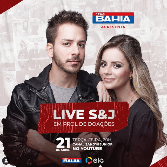 Após um convite da Casas Bahia, Sandy e Junior anunciaram que farão uma live especial na próxima terça-feira, dia 21, às 20h, no canal do YouTube da dupla. A iniciativa tem o objetivo de arrecadar doações para ajudar as pessoas que estão em vulnerabilidade devido a crise causada pelo novo coronavírus.