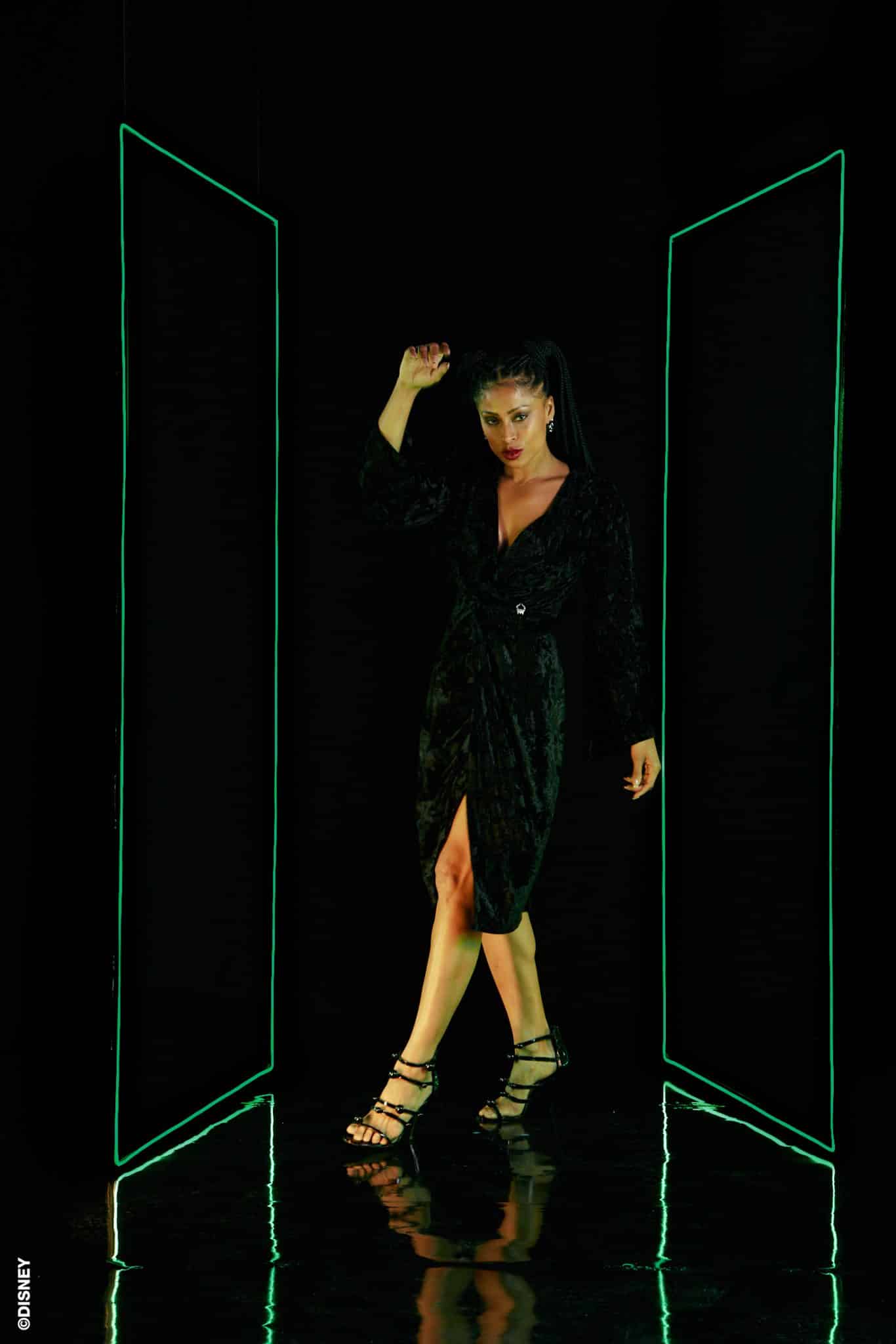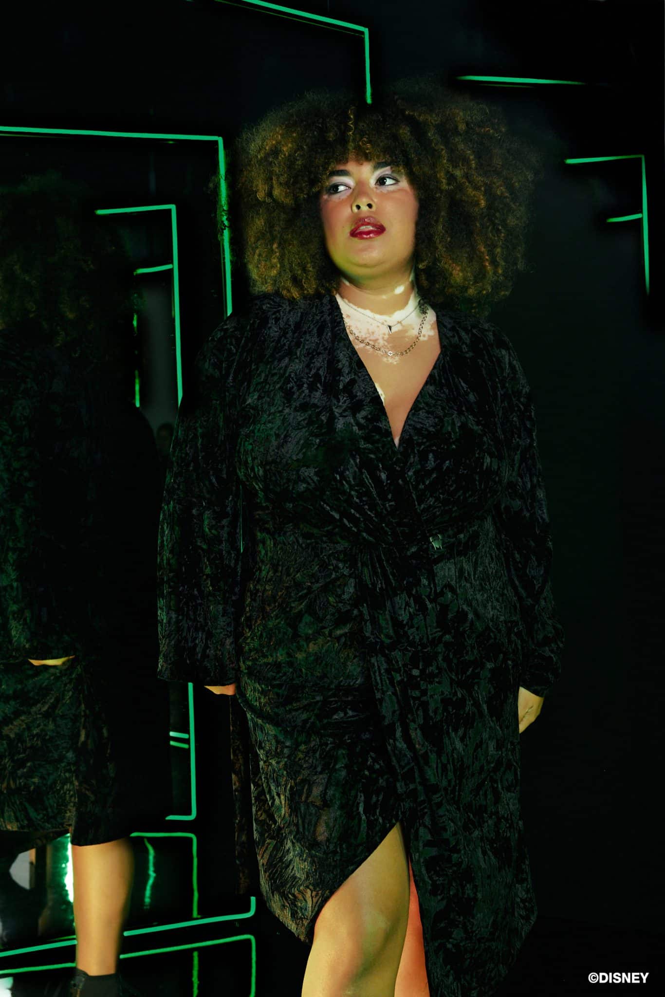 Inspirada na enigmática Malévola, a peça representa toda a presença desta vilã. Pensado em um tecido mais tradicional, o veludo molhado, também traz à tona toda elegância e poder. Os recortes presentes no vestido, remetem as linhas pontudas e chifres tão característicos dessa personagem.