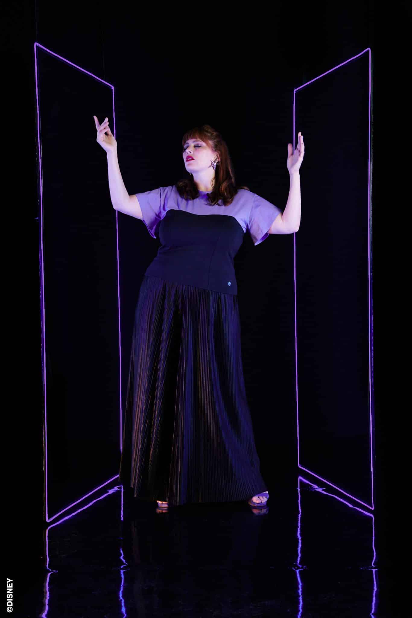 A t-shirt corset inspirada na envolvente vilã Ursula apresenta as cores e formas que representam a personagem. O roxo remete à sua pele e aos seus tentáculos, enquanto os recortes e o decote arredondado em preto lembram seu vestido icônico. A peça transmite toda a exuberância e dramaticidade da personagem, sem mencionar sua silhueta.